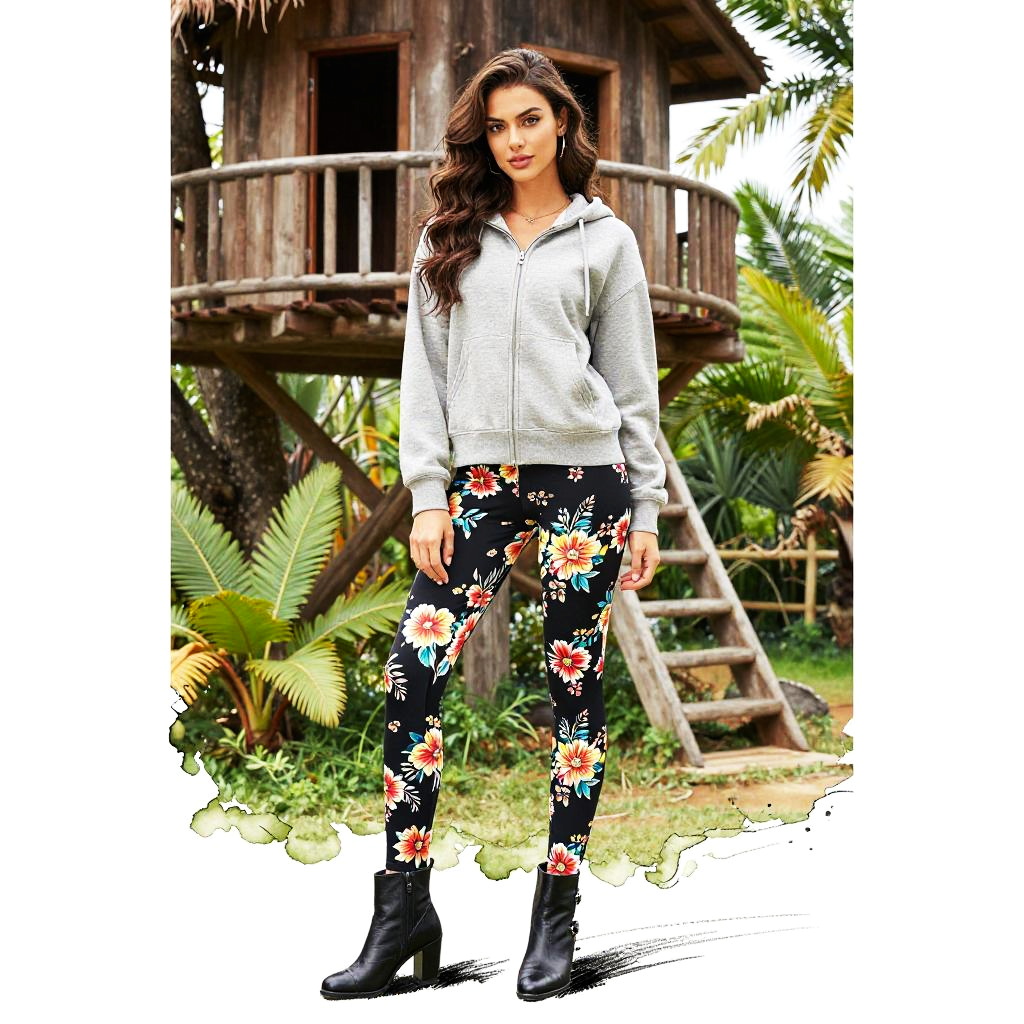 A willowy woman wearing a light grey hooded sweatshirt with a front zipper paired with fitted black leggings adorned with vibrant floral patterns. She is also wearing black ankle boots with a slight heel. The woman stands confidently in a tropical garden setting, featuring lush green plants and a rustic wooden treehouse with a small ladder in the background. Her hair is long and wavy, complementing her pretty face and expressive eyes.