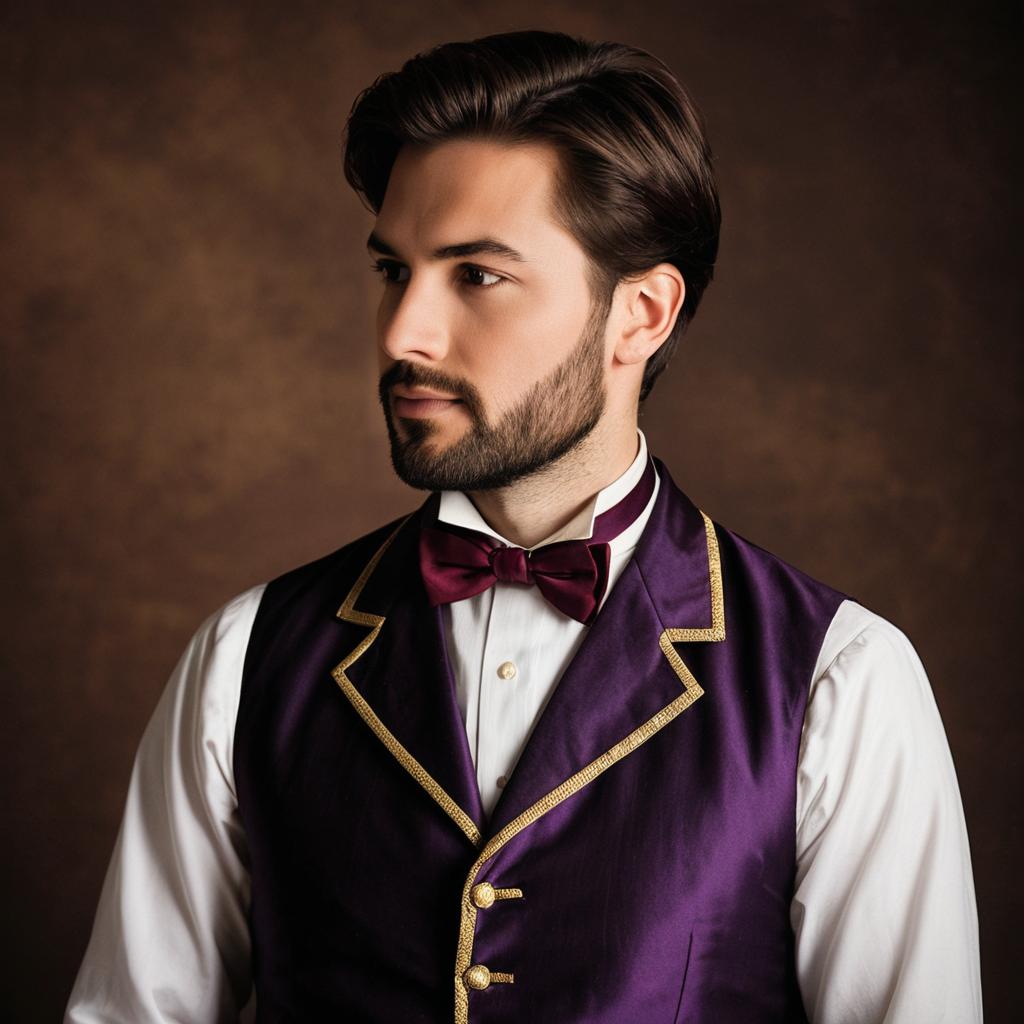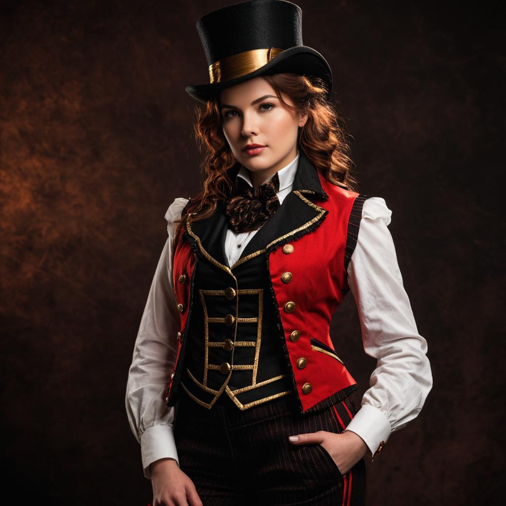 Steampunk male cosplay, photograph, steampunk male, standing, front view, medium shot, brown top hat with decorative band, white long-sleeve shirt, brown vest with brass buttons and chains, brown trousers, brown leather belt with brass buckle, brown leather gloves, stern expression, grey and brown smoky background, Victorian style, vintage clothing, detailed ures, realistic, professional portrait, realistic lighting, studio setting