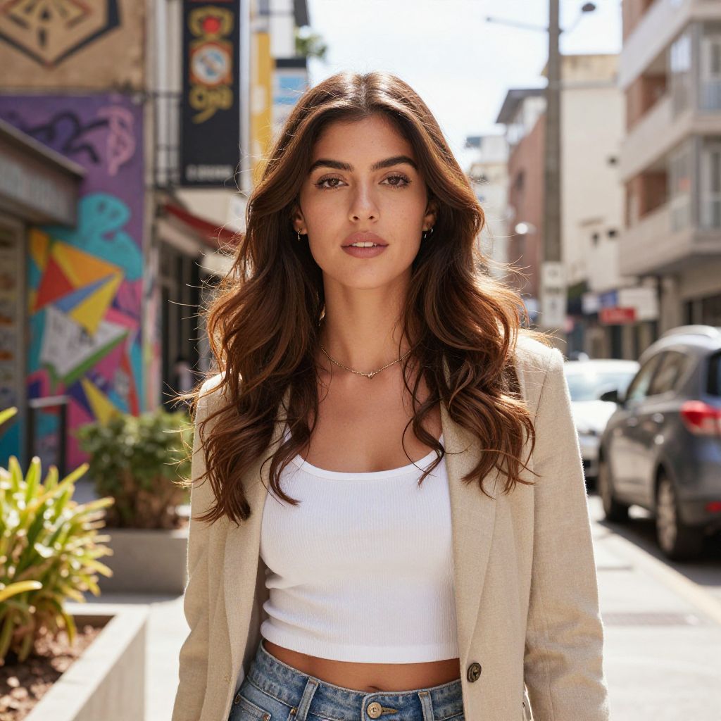 A confident, naturally lit woman with olive skin and straight black hair walks through a sunny city park during early spring. She is wearing a light sheer crop top that flares slightly at the edges, showing her arms and upper chest with subtle elegance. The setting features green lawns, blooming cherry trees, and a soft breeze making the fabric flutter slightly.