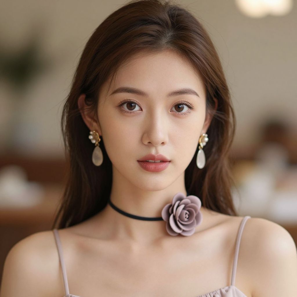 Photograph of an Asian woman with long, dark brown hair and fair skin, wearing a light pink spaghetti strap top. She has large, almond-shaped brown eyes, subtle makeup, and a neutral expression. She wears a black choker with a grey rose brooch, and dangling pearl earrings. The background is softly blurred, featuring indistinct indoor elements like tables and chairs, suggesting a cozy, well-lit room. The overall style is elegant and contemporary, with a focus on her delicate, refined appearance.
