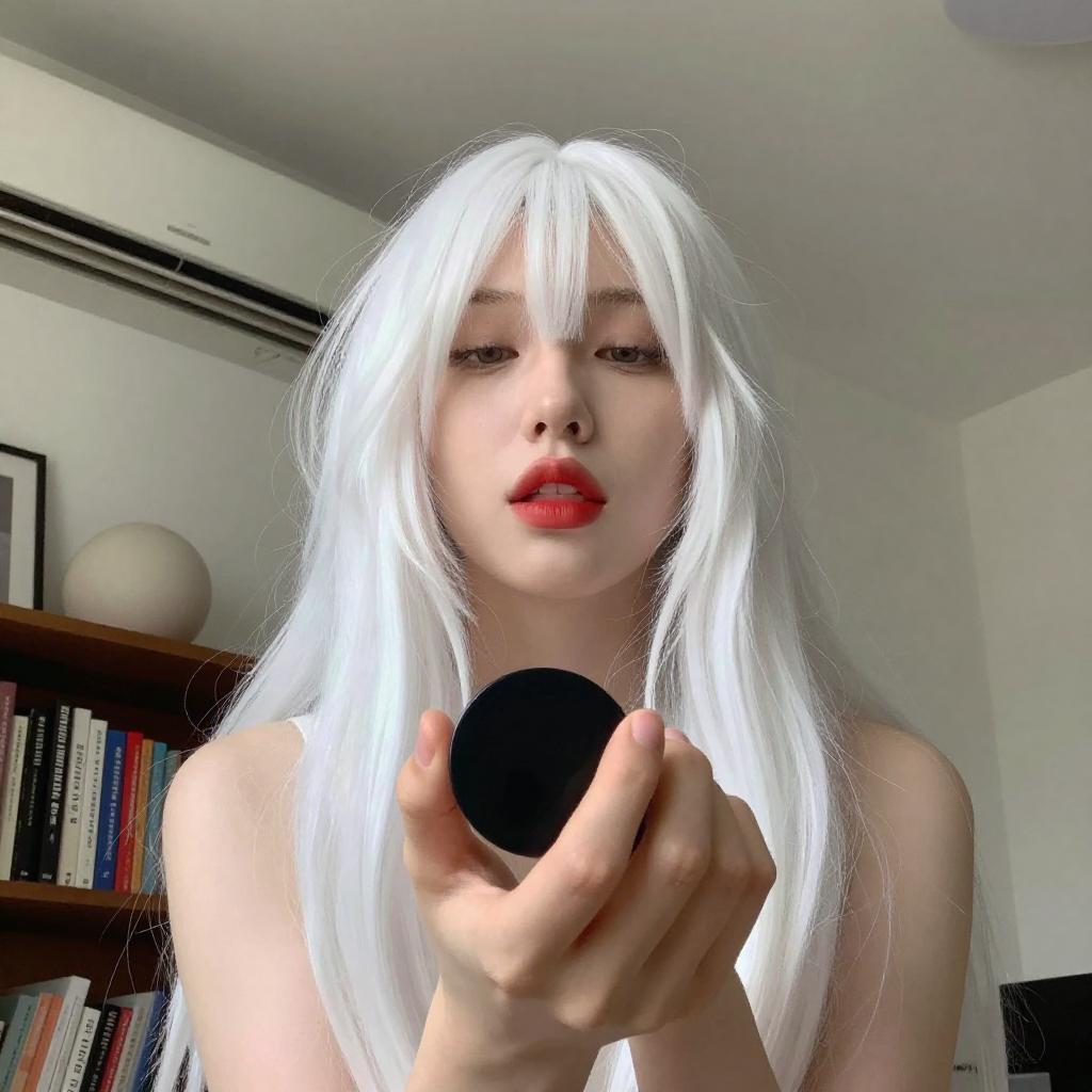 Photograph of a nude woman with pale skin and white hair, viewed from a low angle. She is holding a black object in her right hand, extending it towards the camera. Her red lips are slightly parted, and she is looking down at the camera. The background includes a bookshelf with books and a spherical object. An air conditioning unit is mounted on the wall above the shelf.
