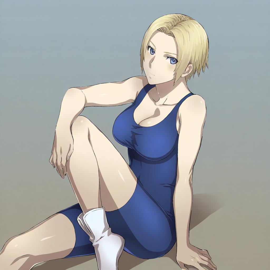 Monk (fft), final fantasy, 1girl, blue eyes, short hair, blonde hair, large breasts, cleavage, bare shoulders, unitard, unitard, by artist arizuka (catacombe), leet