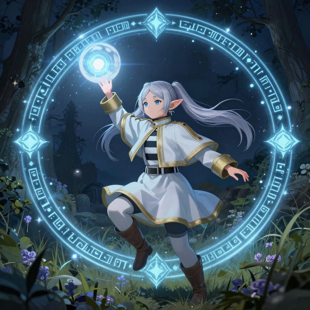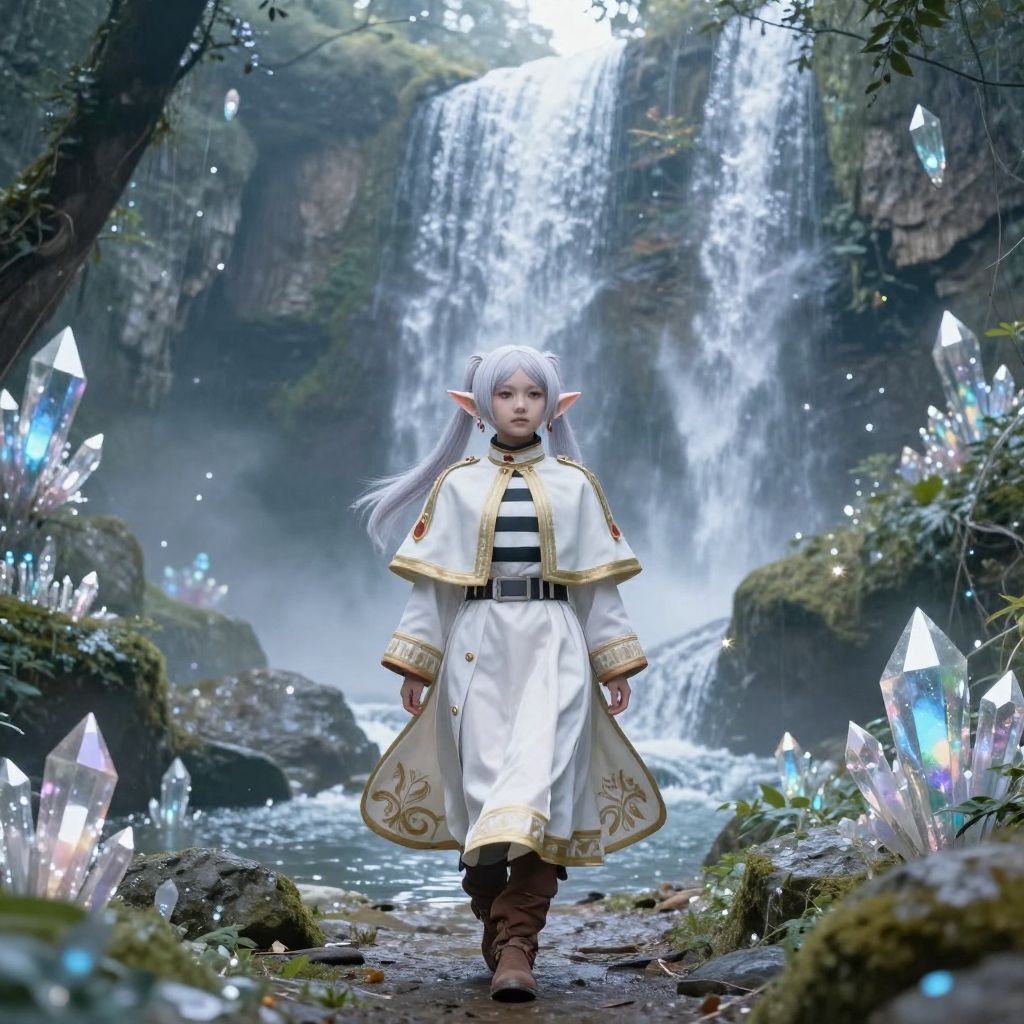 Frieren elves dressed in flowing robes adorned with intricate patterns, walking through a mystical valley with floating crystals and shimmering waterfalls, enchanting and serene atmosphere