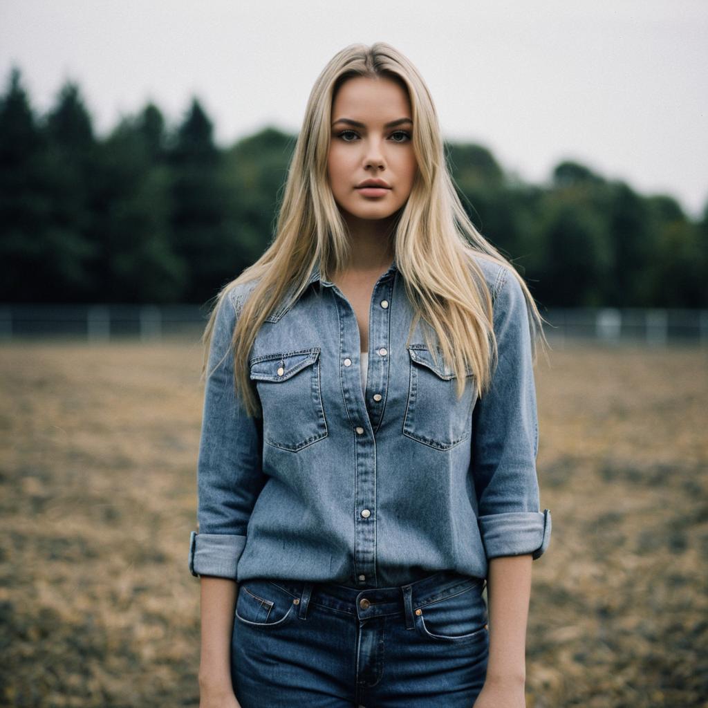 Portrait of a young woman with blonde hair in a braid wearing traditional German lederhosen shorts with suspenders and a white collared shirt. She stands outdoors on a dirt path surrounded by fields and blurred forest background, hands casually in pockets, with a confident gaze towards the camera.