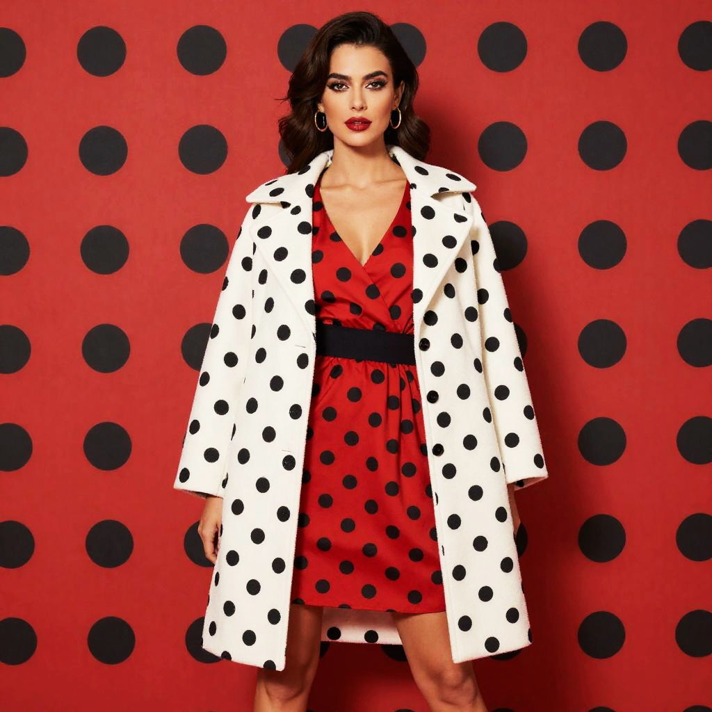 A stylish woman poses confidently against a vibrant red and black polka dot backdrop. She wears a striking red dress with black polka dots, complemented by a white coat featuring large black dots, evoking a bold and modern retro-inspired fashion aesthetic.