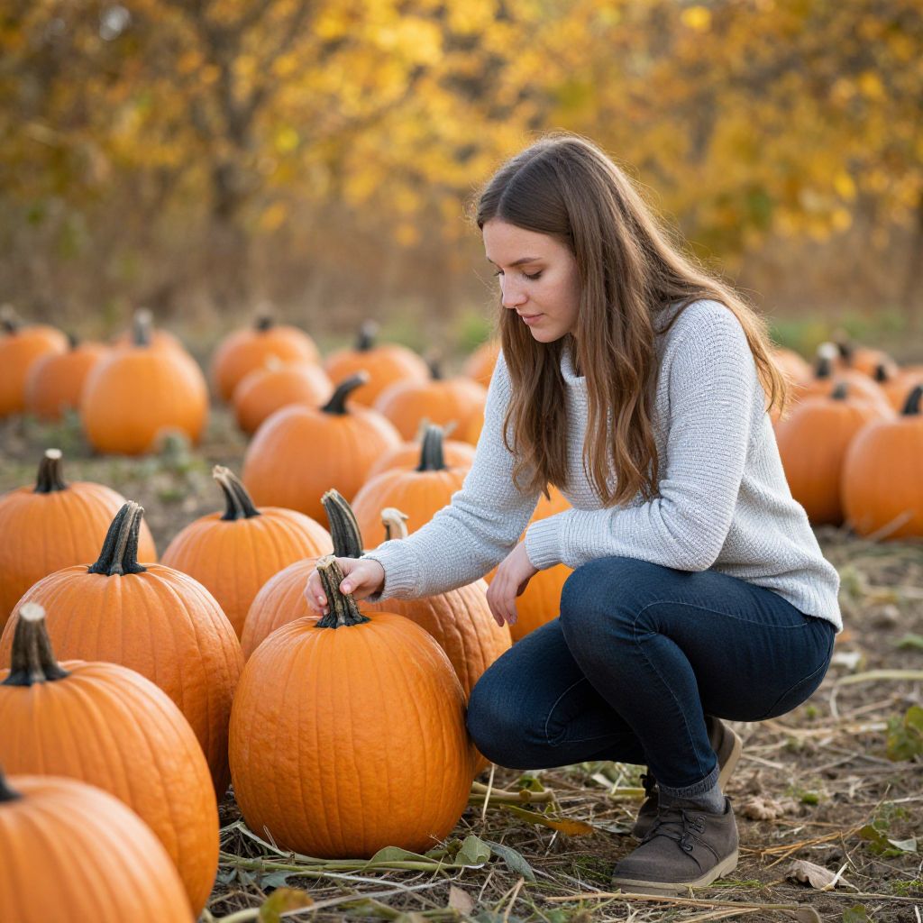 Young woman crouching amidst rows of vibrant orange pumpkins, carefully selecting a ripe specimen in a picturesque autumnal field under golden foliage.
