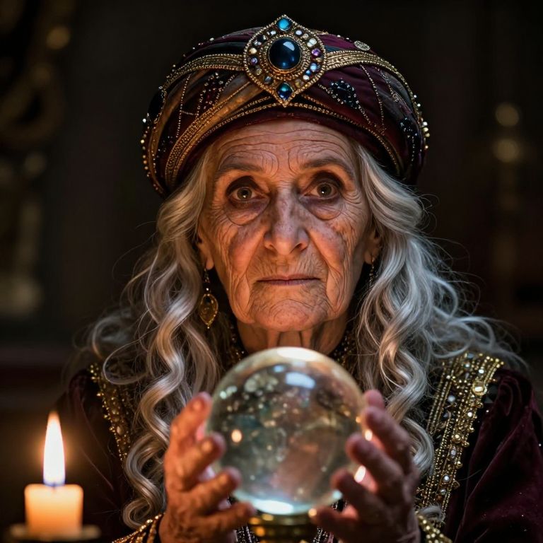 Photograph a photorealistic portrait of an elderly fortune teller with pronounced wrinkles around her eyes. Her silver hair falls in loose curls past her shoulders. The scene is illuminated by soft candlelight from an unseen source, casting dramatic shadows on the teller's face as she intently gazes at a crystal ball held close to her chest. Capture this from a low-angle perspective, focusing on the intricate details of her ornate turban adorned with gemstones and gold threads, while emphasizing the captivating aura surrounding her.