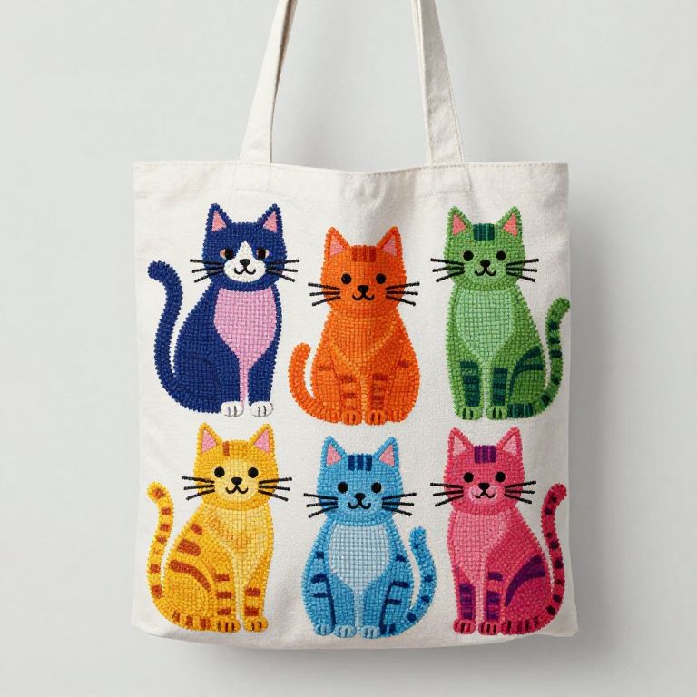Colorful, embroidered cat tote bag featuring six cartoon-style cats in blue, orange, green, yellow, pink, and red on a white background.