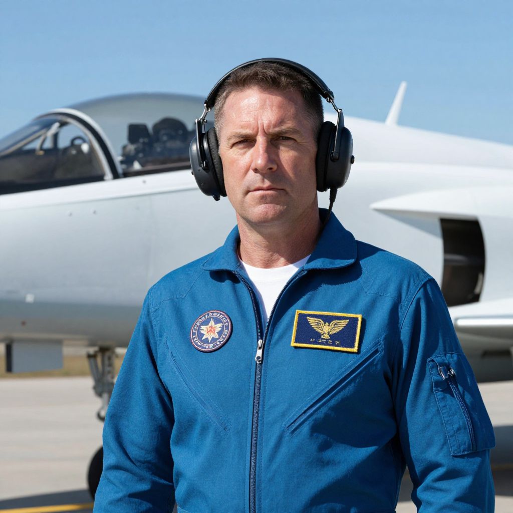 Photograph of a middle-aged Caucasian man with short brown hair, wearing a blue flight suit and black headphones, standing in front of a white and black military jet on a sunny day. The man has a serious expression and a patch with a round emblem on his left chest. The jet is partially visible in the background, with a clear blue sky above.