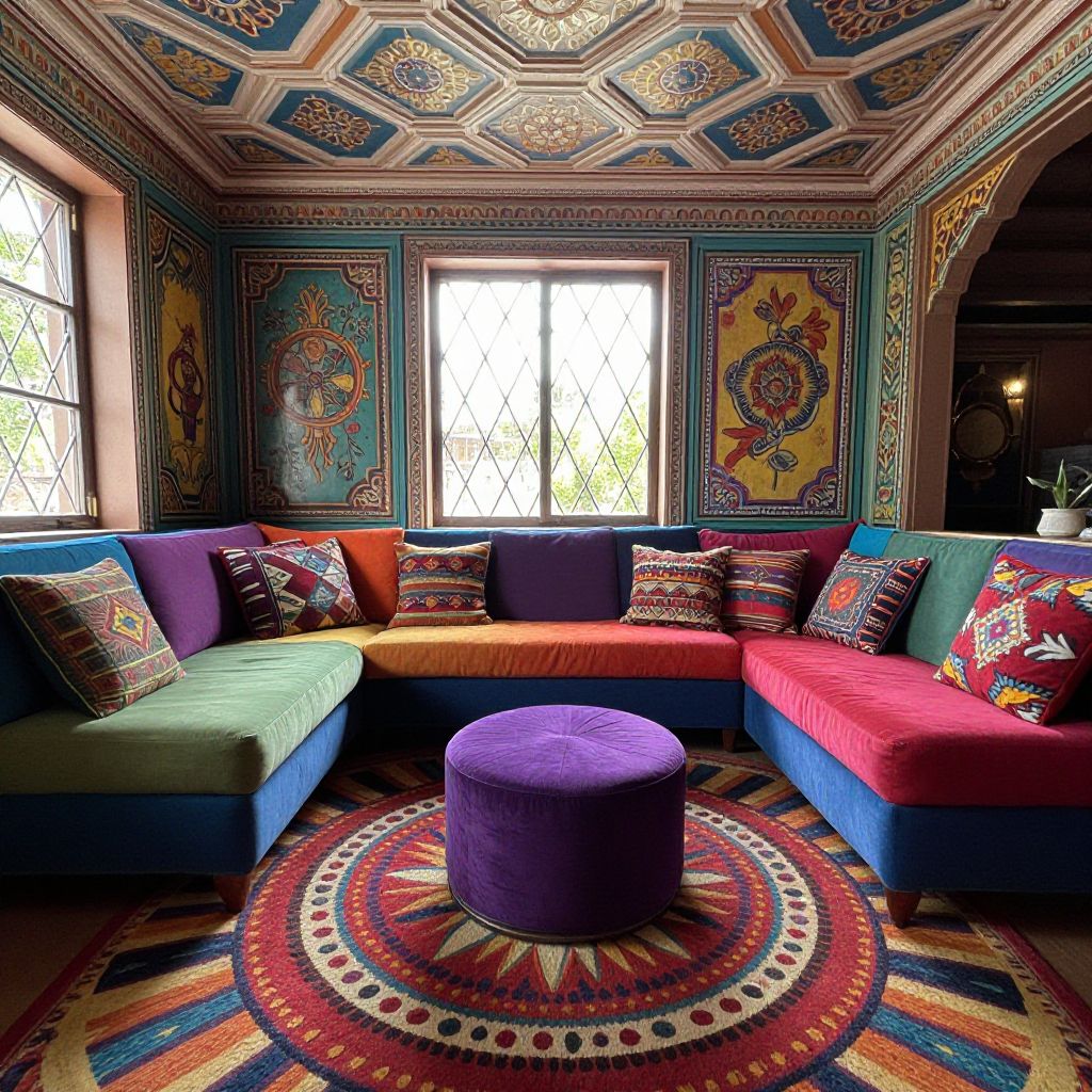 Vibrant bohemian living space showcases a colorful L-shaped sectional sofa adorned with patterned cushions, positioned centrally on a bold, circular-patterned rug, complemented by a plush purple ottoman, all surrounded by intricately painted walls and a geometrically detailed ceiling, with natural light streaming through a diamond-paned window.