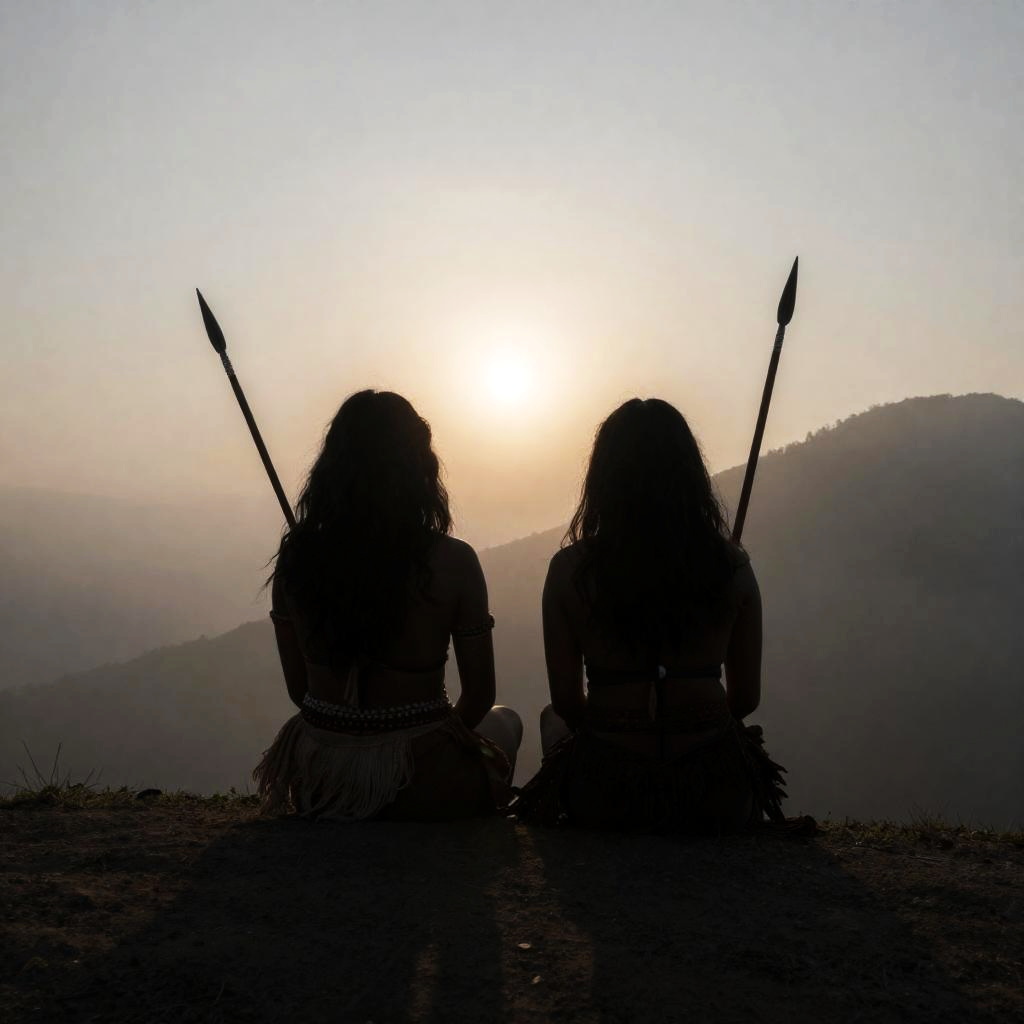 Silhouetted photograph of two people with long hair and tribal clothing, sitting on a hilltop, back to the camera. Sun is behind them, creating a halo effect. One person holds a spear, the other a stick. Hazy background with a mountain on the right. Misty, ethereal atmosphere.