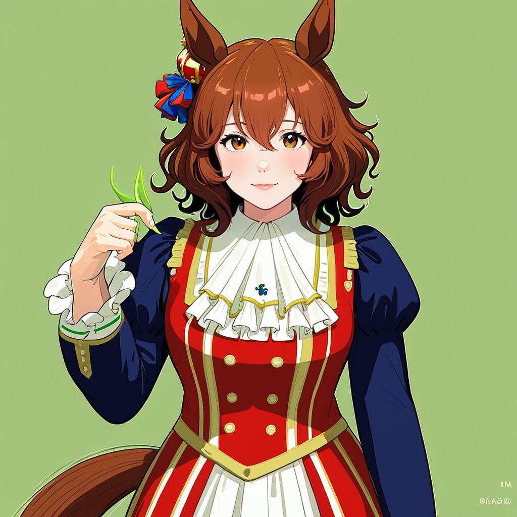 Aston machan (umamusume), umamusume, 1girl, horse girl, horse ears, horse tail, green eyes, hair between eyes, brown hair, medium hair, large breasts, medium breasts, long sleeves, crown, by artist cream (nipakupa), anime