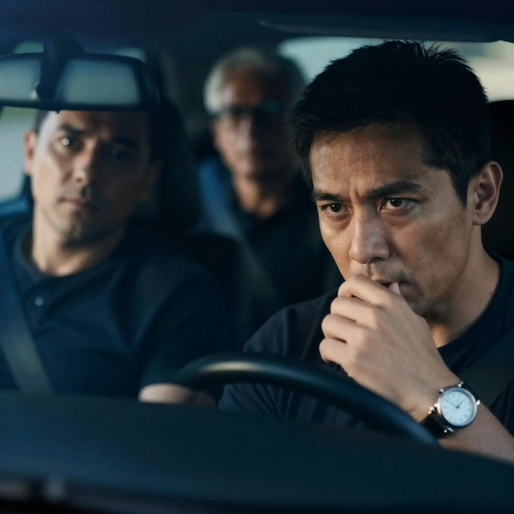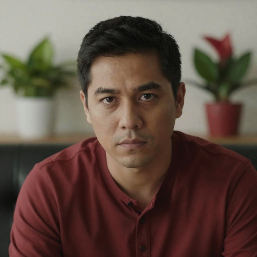 Close-up of a sweaty, middle-aged man with short, wet hair and blue eyes, looking upward. His face is glistening with sweat. Background is blurred greenery. Man is shirtless, focus on his face and upper chest. Upper body centered, eyes wide, slightly open mouth.