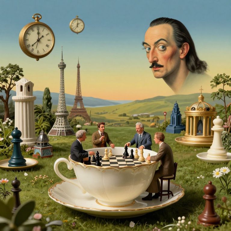 Create an image in the style of surreal landscapes, depicting a serene garden scene from a 'bug's-eye view', focusing on a teacup-sized garden inhabited by miniature figures engaged in animated discussions over a chess match. The chess pieces are intricately designed sculptures that mimic famous world landmarks, set against a dreamlike background with distorted timepieces and floating objects suspended in air. This panoramic image should evoke a sense of whimsical wonder while preserving the surreal essence of Dali's iconic art style, blending humor, history, and fantasy into an enchanting visual tapestry.