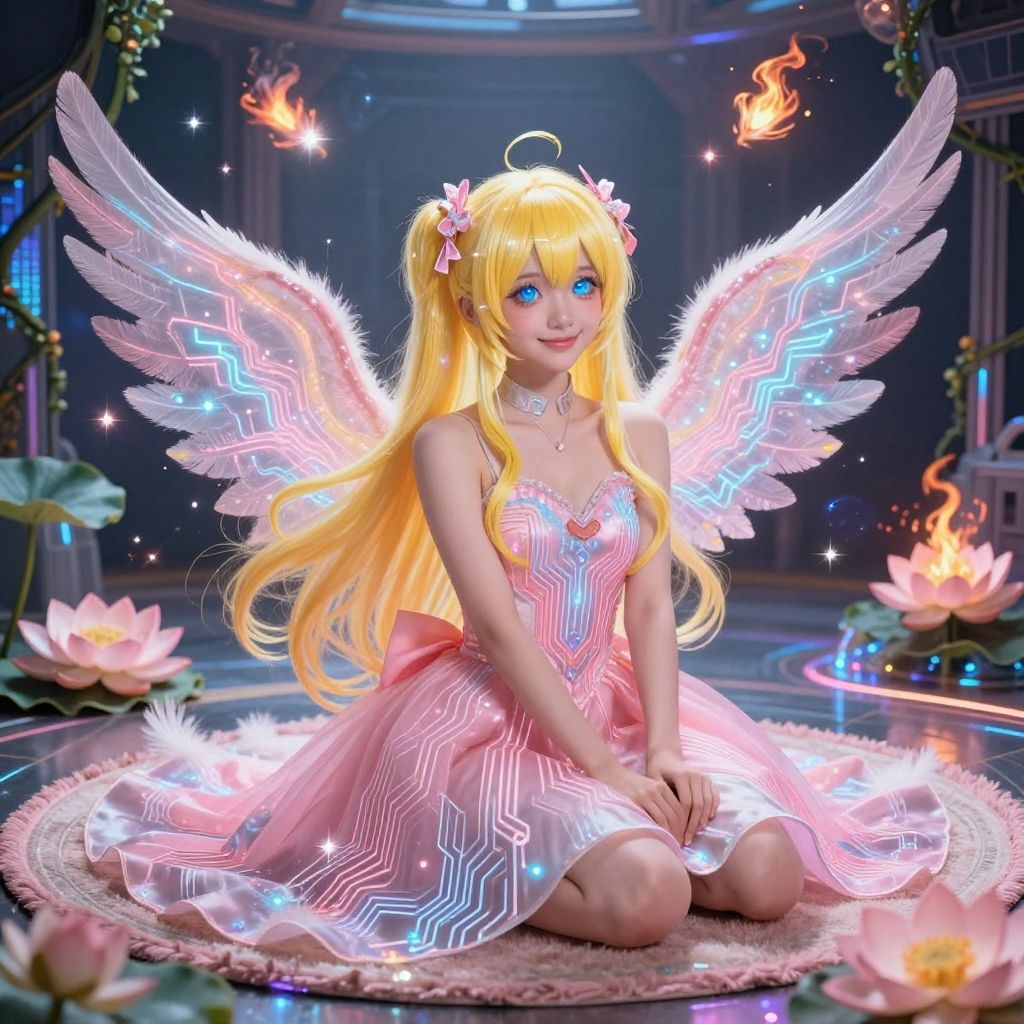 Electronic circuit pattern dress, electronic circuit pattern, miku, masterpiece, best quality, 8K, (photorealistic:1.4), (Vivid colors:1.3), (content expression:1.3), Electronic girl. Cyberpunk magic. Electronic wings dress. Electronic room. A world with an original and fantastical atmosphere. A world with an original and fantastical atmosphere, smile, yellow Electronic hair, blue Electronic eye, pink long dress, cute, soft, cool, kawaii, flower, thin, wind, sit, skart, soaring feathers, Lens flare, glitter, lotus, vine, electronic room, fly, fire, water, rug, ring, float, wing dress, warp, rise, Transform
