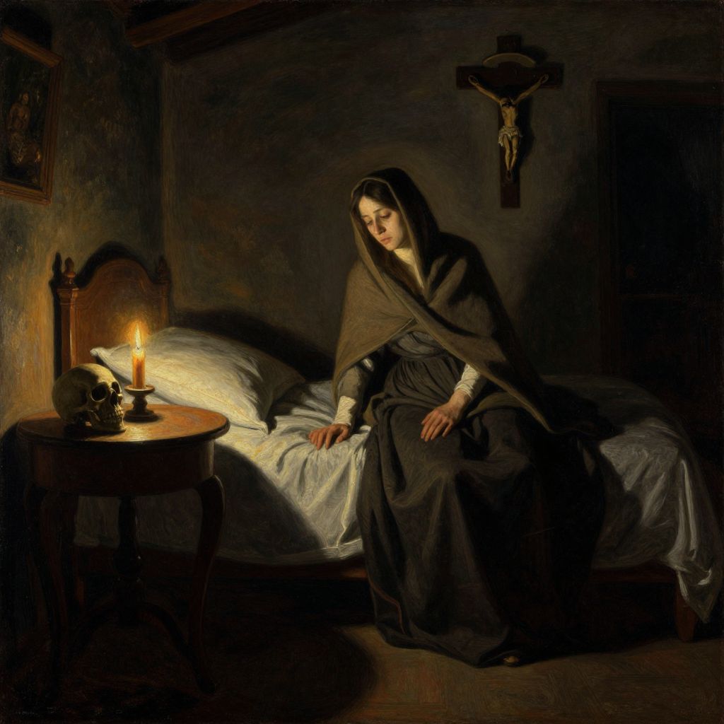 Photograph-style digital painting depicting a dimly lit, medieval-style bedroom. A somber woman with pale skin and dark hair, dressed in a brown cloak and long dark dress, sits on a bed with white sheets. A single candle on a round wooden nightstand emits a soft, warm glow, casting shadows. A skull and crossbones hang on the wall behind her. The room's dark, textured walls and wooden furniture add a somber, historical feel. The woman's expression is pensive, her gaze directed downward. The overall mood is dark and introspective.