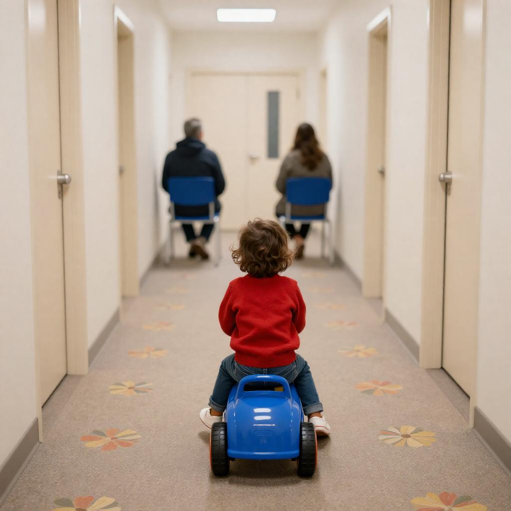 Photograph of a child in a red sweater, from behind, pushing a toy car down a floral-patterned hallway. Two adults in blue chairs at the end. Cream-colored doors, carpeted floor, overhead lights. Child's brown hair, blue toy car.