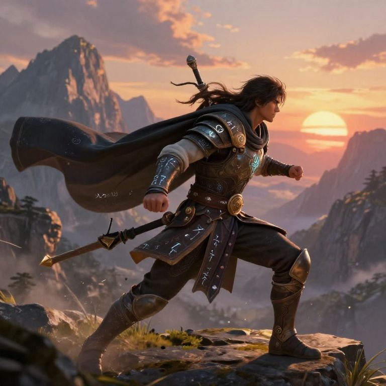 A digital fantasy artwork depicts a muscular, dark-haired male warrior in detailed, silver-embellished armor, poised on a rocky outcrop during a dramatic sunset. He wears a flowing black cape, with a sword strapped to his back and another sheathed at his side. His right arm is extended forward, fists clenched, while his left arm is back. The background showcases a breathtaking, mountainous landscape with jagged peaks and a colorful sky, tinged with orange and pink hues. The warrior's determined expression and dynamic stance convey strength and readiness. The image is highly detailed, with realistic textures on the armor and rocky terrain.