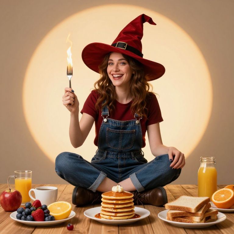 Sitting cross-legged on a wooden table laden with a vibrant spread of breakfast foods, a cheerful witch in a red hat and overalls holds a fork emitting a small flame, surrounded by fresh fruits, pancakes, sandwiches, and a jar of orange juice, all illuminated by a warm, circular light backdrop.