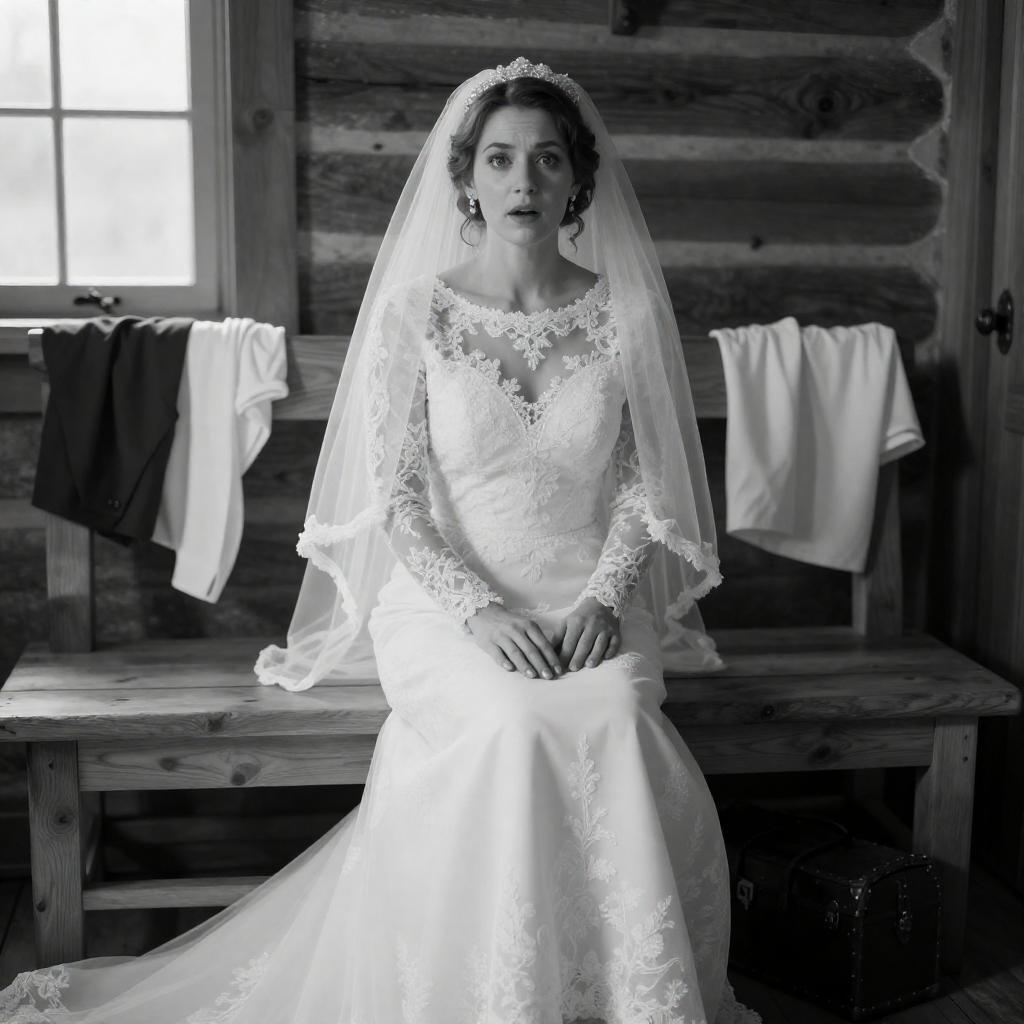 Black and white photograph of a wedding. Bride in white dress and veil, holding bouquet, shaking hands with groom in dark military uniform. Background has ornate altar with candles and religious statues. Bride looks down, groom looks at her. Both wear gloves. Bride on left, groom on right. Intense expressions on groom's face.
