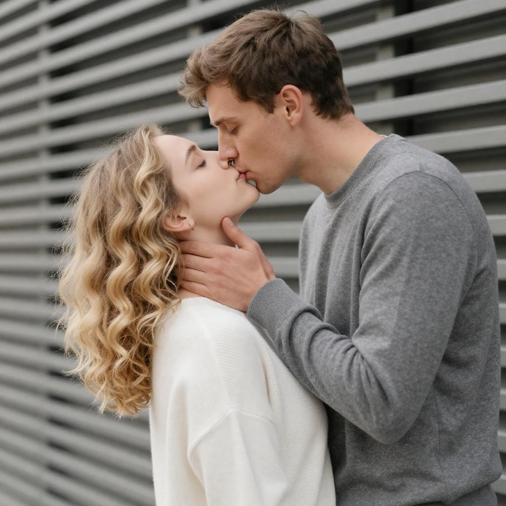 A young romantic couple sharing a tender kiss outdoors. The man has short brown hair and is wearing a gray sweater, gently holding the neck of a blonde woman with curly hair, who is dressed in a white sweater. The background features a modern, horizontal slatted structure.