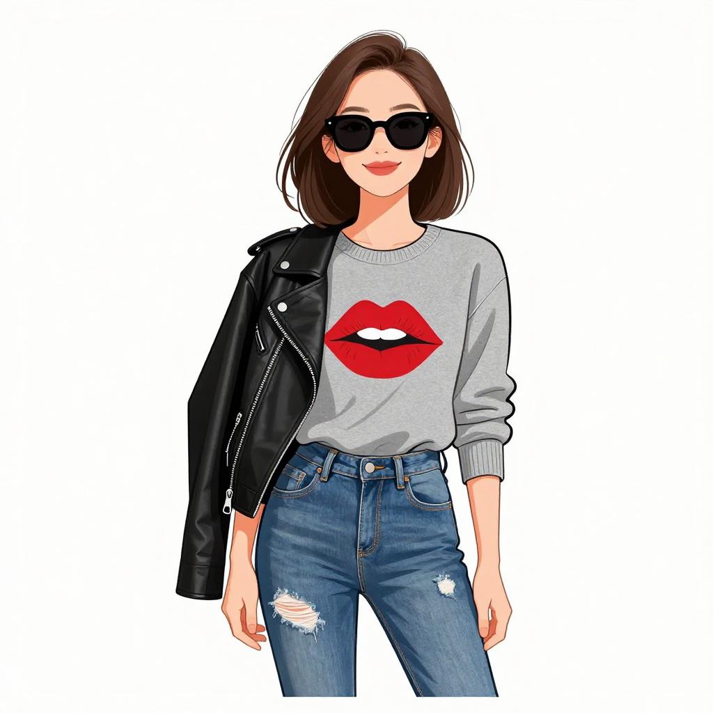 Woman with pretty face and pretty hair. smiling Woman, casual, grey long-sleeve sweater with red lip print, fitted blue denim jeans with distressed detailing, draped black leather jacket over shoulder, simple black sunglasses. --sref 1467