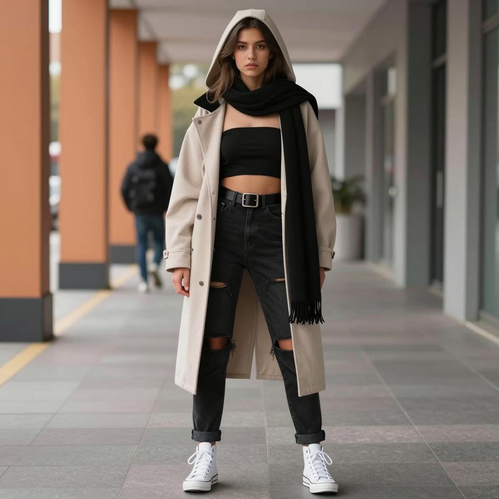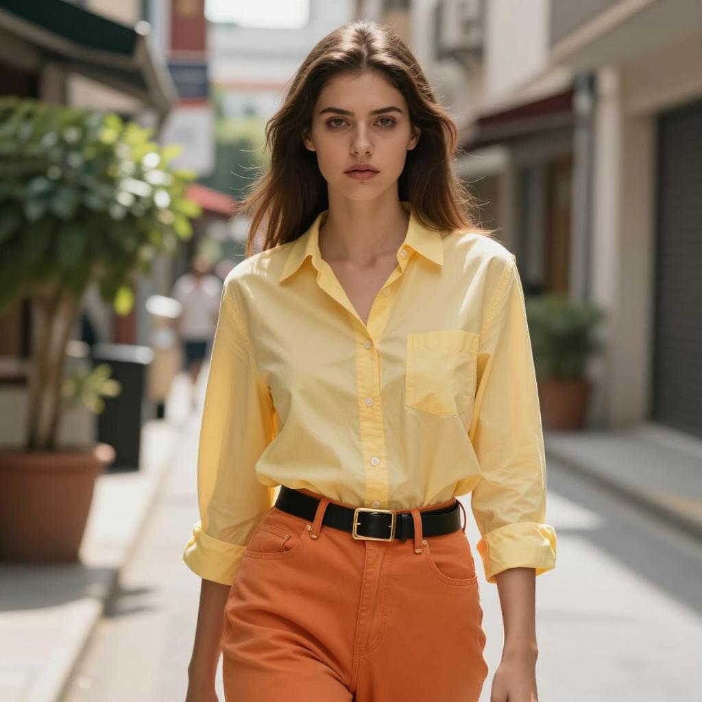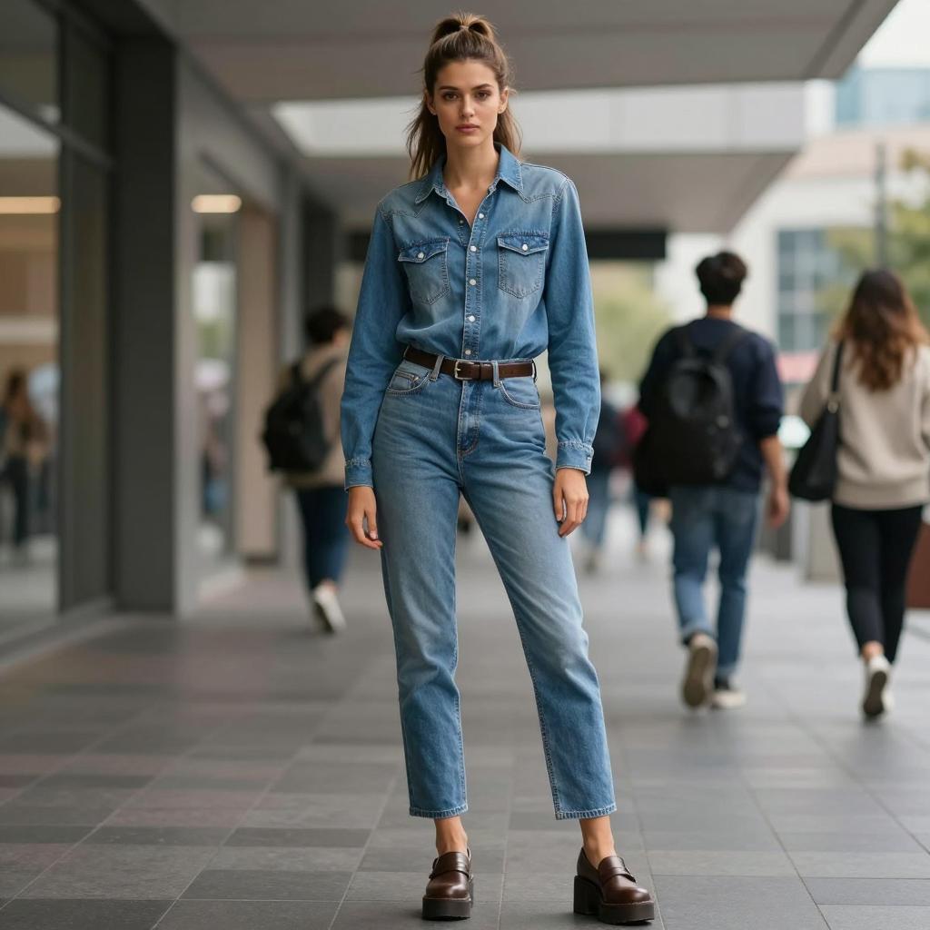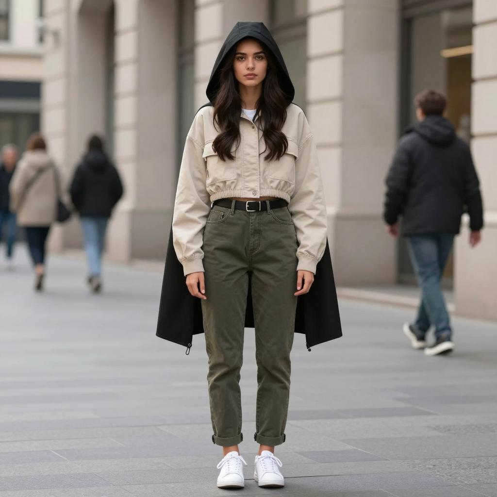 Young Woman in Casual Urban Outfit on Cobblestone Street