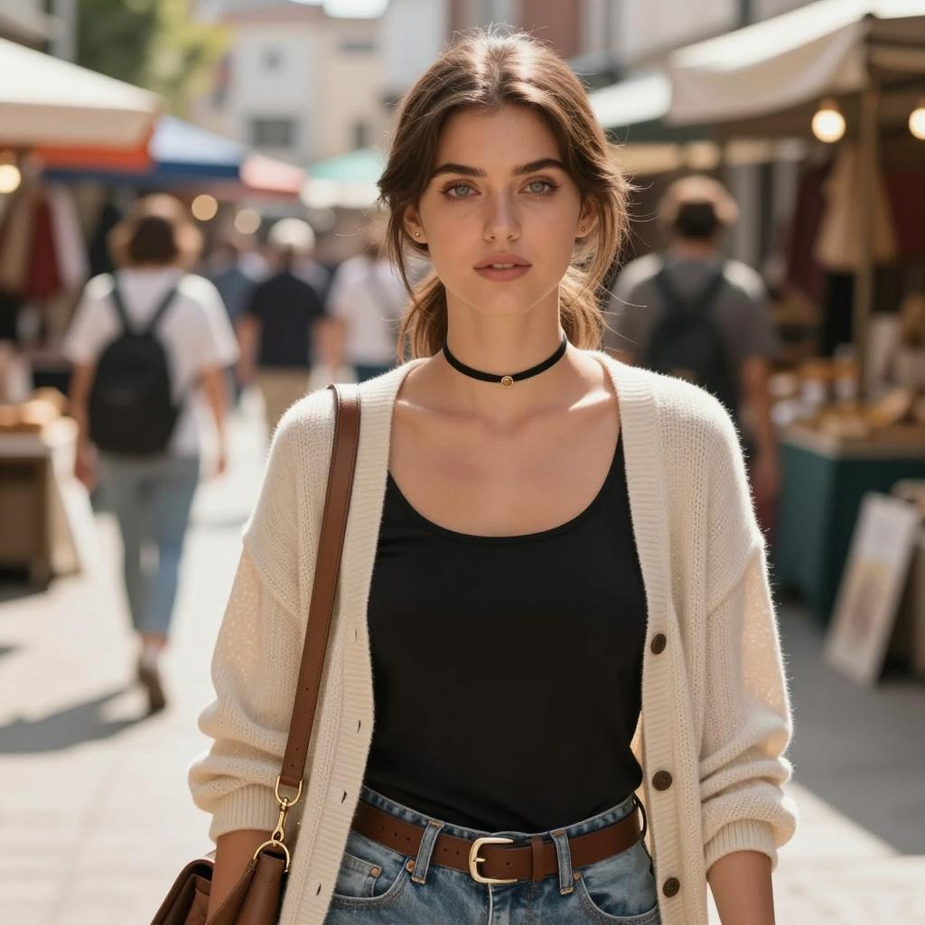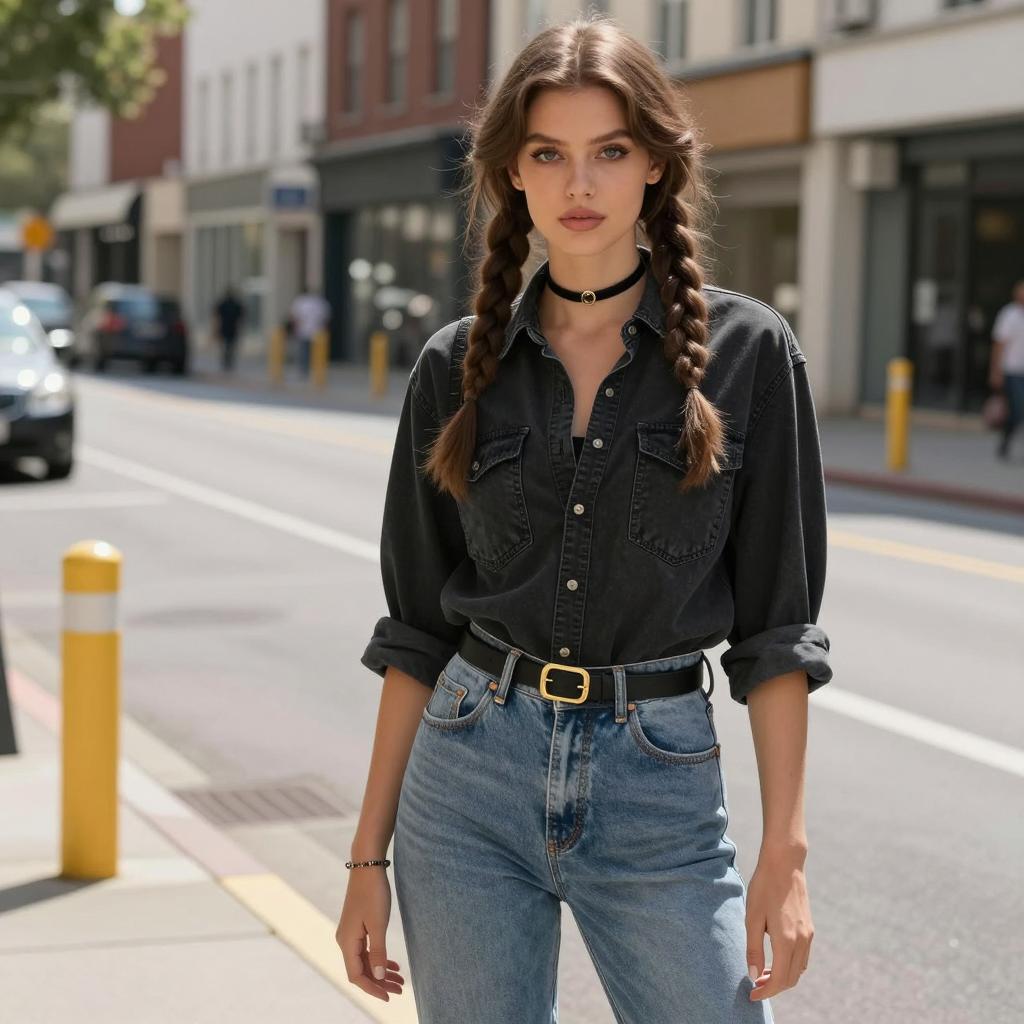 Downtown doll adult costume, photorealistic, fashion photography, young woman, standing on cobblestone street, urban background, daytime, brown hair, straight hair, casual outfit, black tank top, white short-sleeve shirt, brown leather vest, distressed black denim shorts, visible rips and patches, brown lace-up boots, thin build, small breasts, light skin, brown eyes, neutral expression, street signs in background, people walking and sitting in background, warm color palette, natural light, slightly blurred background, modern urban style, trendy fashion, realistic ure, detailed clothing, fashionable, casual streetwear