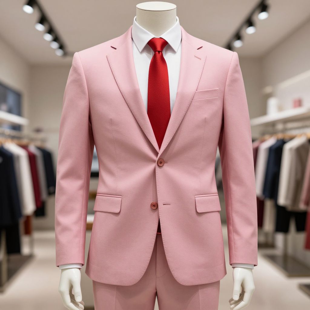 A mannequin standing confidently in a stylish store display, wearing a sharp pink suit with a crisp white shirt and a bold red tie, the outfit exuding elegance and modern sophistication. The mannequin has a sleek, humanoid form with detailed fabric textures, and its face is neutral and expressionless, typical of mannequin design, enhancing the focus on the clothing. The setting is a bright, modern retail environment with soft ambient lighting, highlighting the vibrant colors of the suit and the polished finish of the garments.