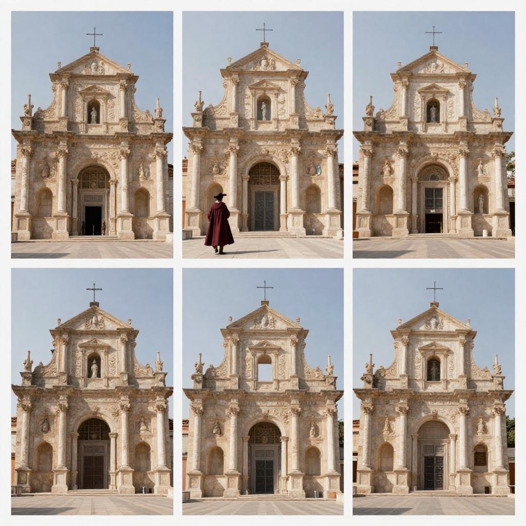 Composite image showing various views of ancient stone structures in Baroque architectural style, featuring ornate columns, arches, and domes in ivory and sandy tones. A scholar dressed in a burgundy cloak and hat is seen walking towards one of the grand buildings in a stage-like outdoor environment. The images highlight detailed craftsmanship and historical design elements.