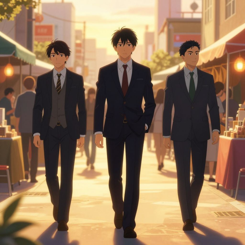 Anime characters that wear a suit walking through a bustling city market during sunset, warm golden light casting long shadows, elegant suits with casual but refined looks, highly detailed background with anime-inspired architecture and colorful crowd