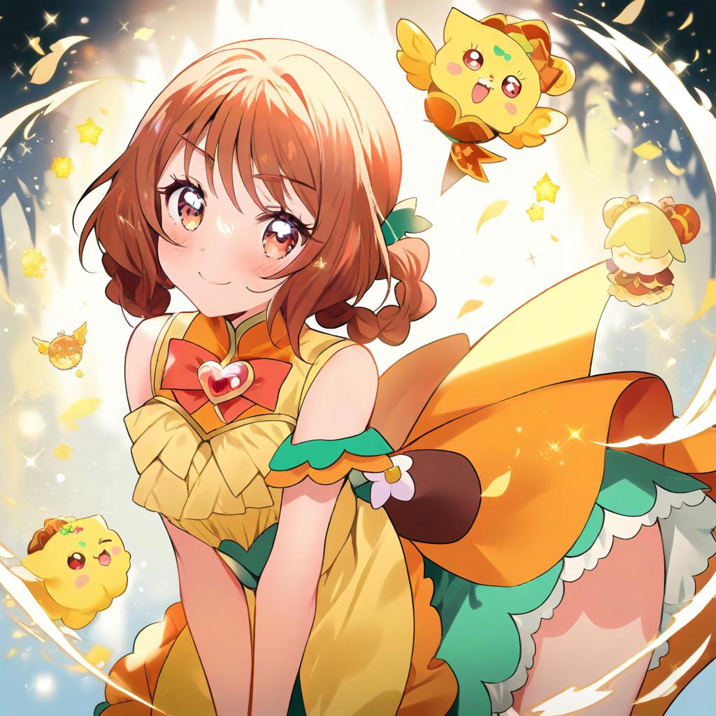 Hanamichi ran, delicious party precure, 1girl, red eyes, brown hair, blonde hair, short hair, medium hair, hair rings, magical girl, by artist usagihime, animagine