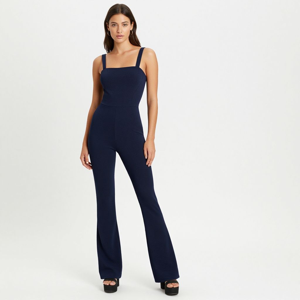 Photograph of a young woman with straight, dark brown hair, standing against a plain white background. She wears a form-fitting, sleeveless, dark navy blue jumpsuit with square straps and flared legs that end just above her black, open-toed, high-heeled sandals. Her skin is light, and she has a neutral expression with slightly parted lips. She stands with her arms relaxed by her sides, legs slightly apart. The lighting is even, highlighting the smooth texture of the jumpsuit and her slender build. Her overall appearance is chic and stylish.