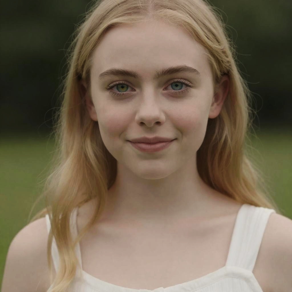 (extreme closeup:1.3) (masterpiece:1.5) (photorealistic:1.1) (best quality) (detailed skin texture hairs:1.1) (intricate) (8k) (HDR) (wallpaper) (cinematic lighting) (sharp focus), ellefanning-smf, 1girl, solo, realistic, blonde hair, green eyes, blue eyes, white dress, smile, mid-body