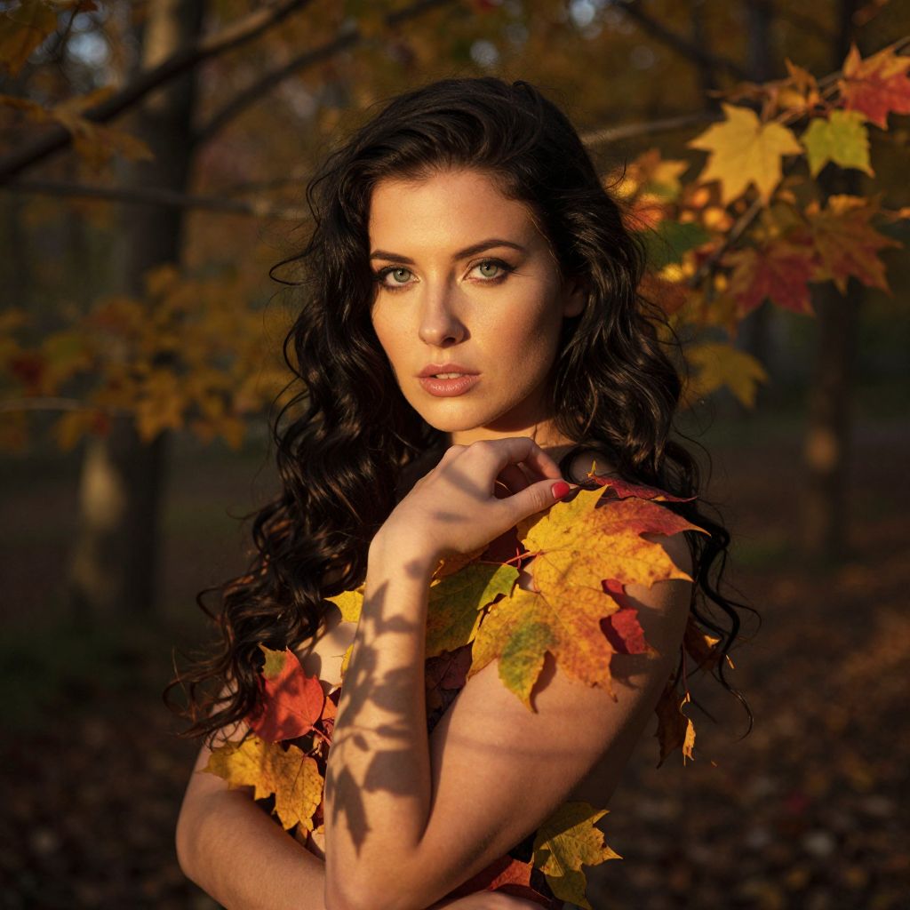 A captivating portrait of a woman in her thirties, with a mysterious and strong aura, is presented. Her long, wavy dark hair and piercing green eyes are framed by vibrant fall foliage, seamlessly integrated as if growing from her skin, adding to her enchanting beauty. An unseen breeze animates the leaves, casting a kaleidoscope of colors upon her serene yet contemplative expression. The golden hour illuminates the scene, with light filtering through dense trees, creating elongated shadows that intertwine with her limbs and the leaves, forming a mesmerizing tapestry of light and shadow.
