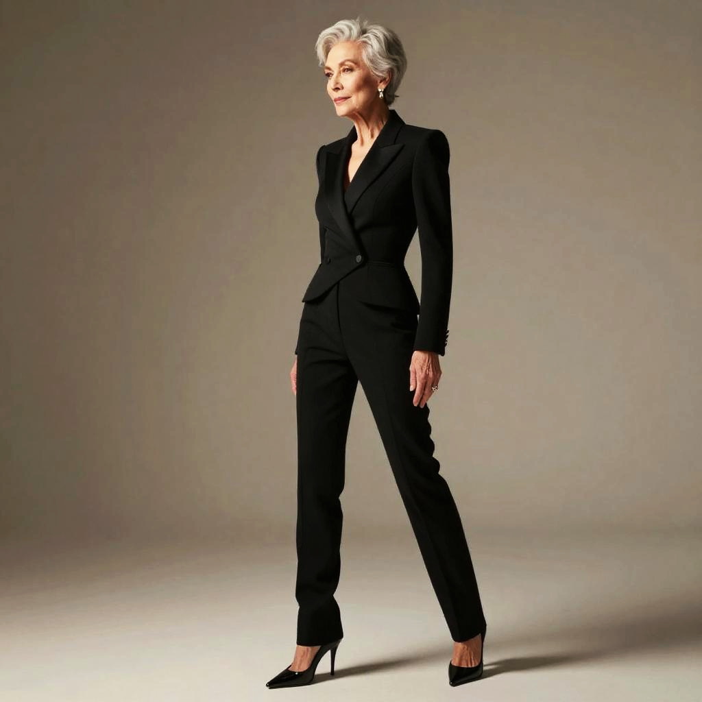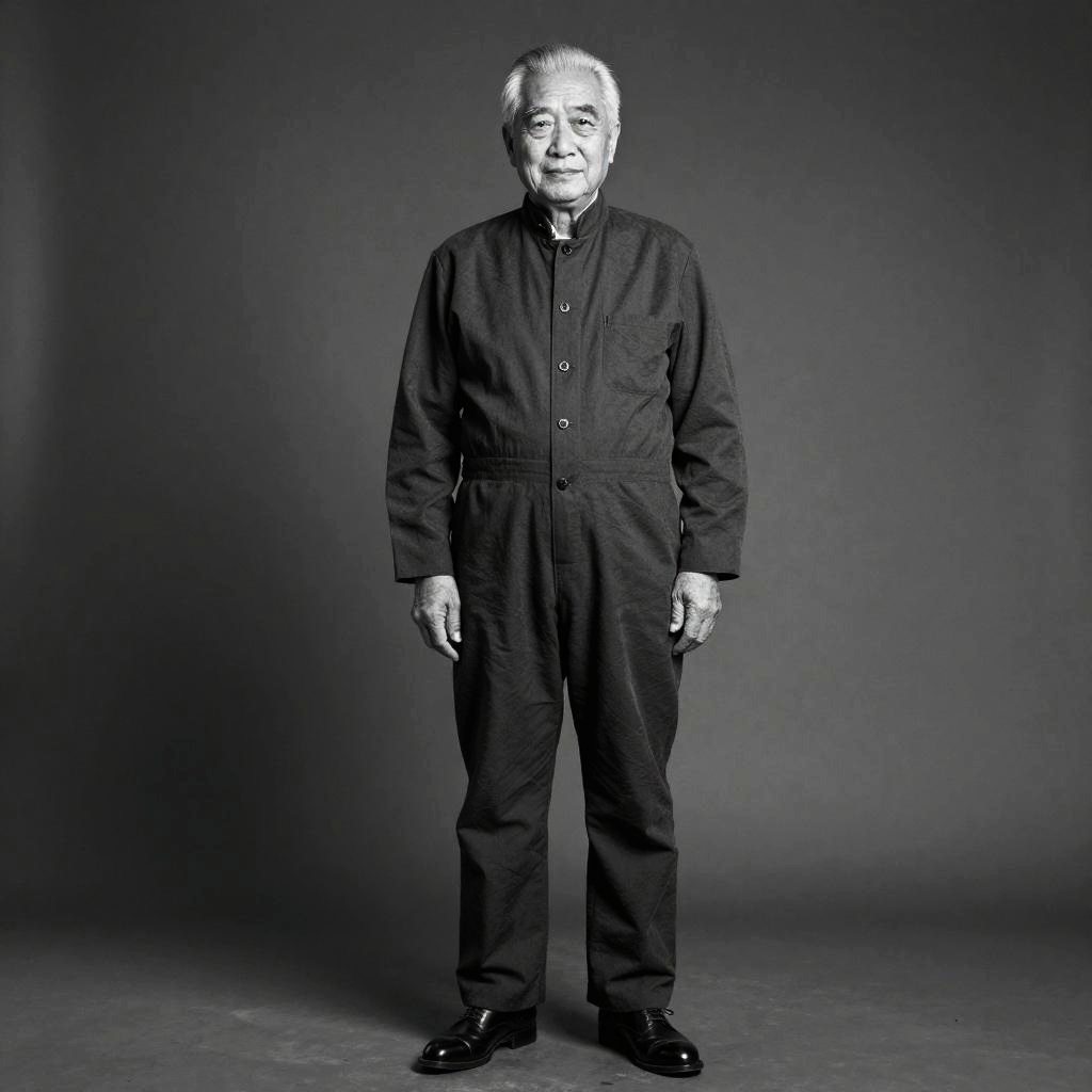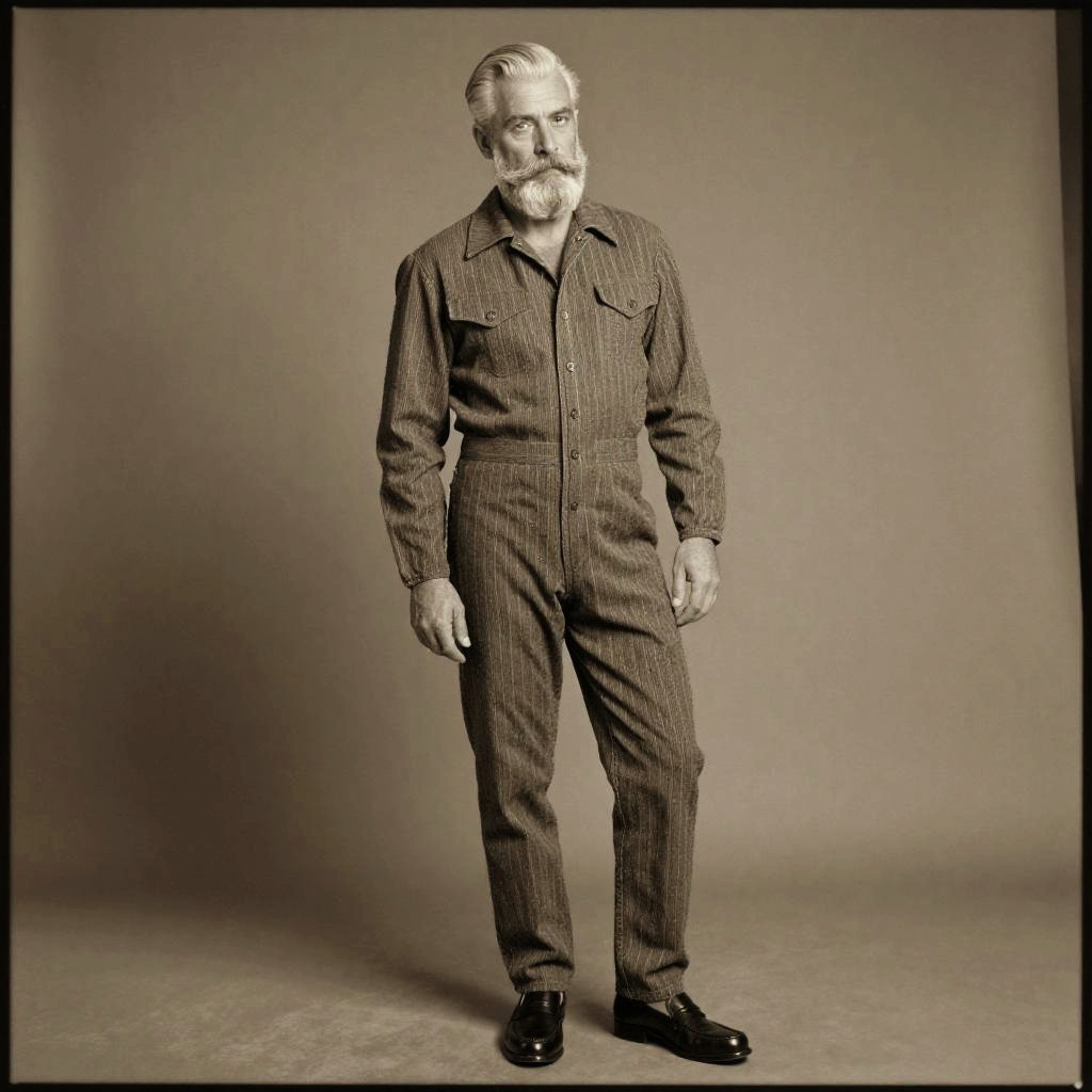Image in the style of Retro Film Photography, classic older gentleman, neatly trimmed beard, slicked-back silver hair, athletic build, jumpsuit outfit, pinstripe jumpsuit, leather loafers, sepia toned vintage studio background