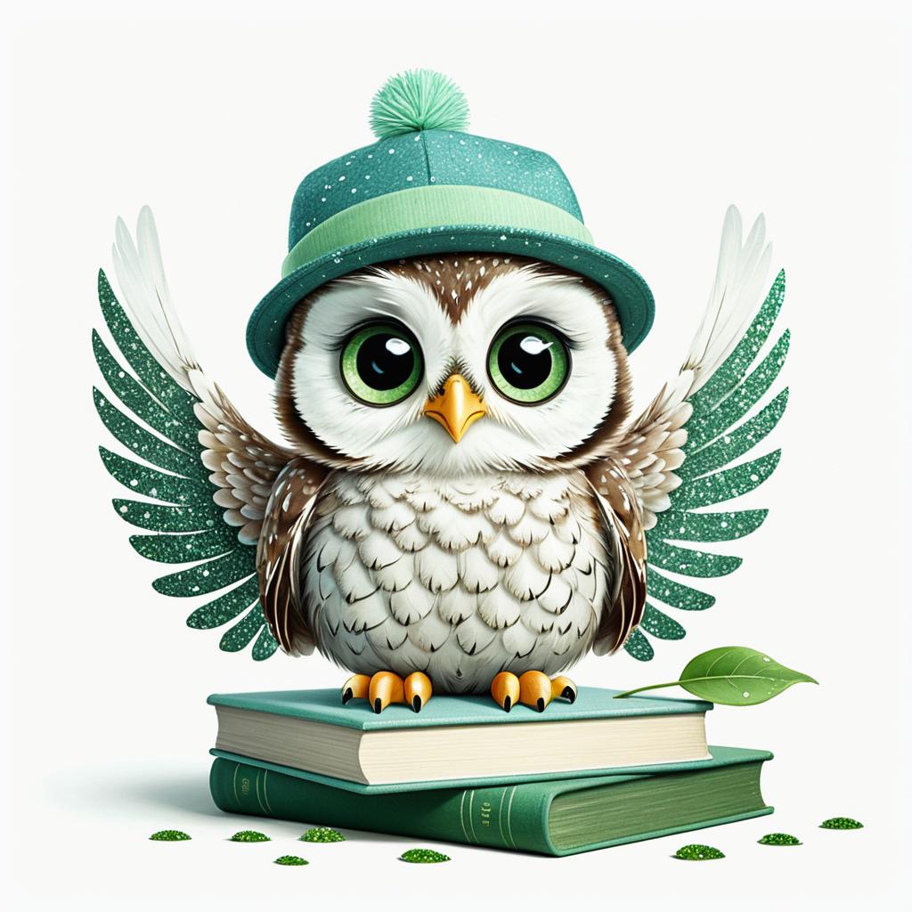 Extremely cute baby elephant character with light blue wings and a green hat, sitting on light blue books with tiny green leaves around, smiley face, light blue glitter eyes, white background, cartoon style, high resolution, high quality