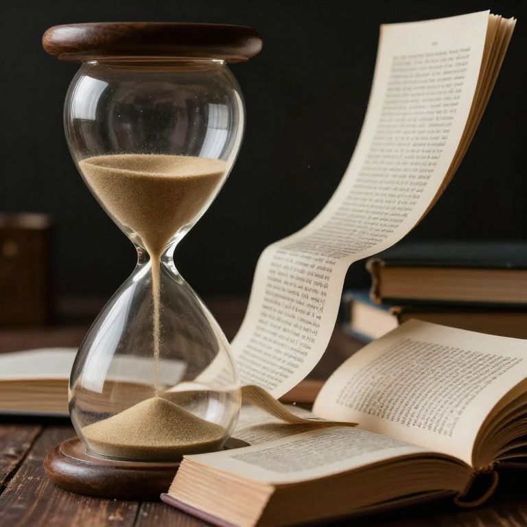 Photograph of a glass hourglass with sand, open books, and a rolled page against a dark background. Time and reading themes.