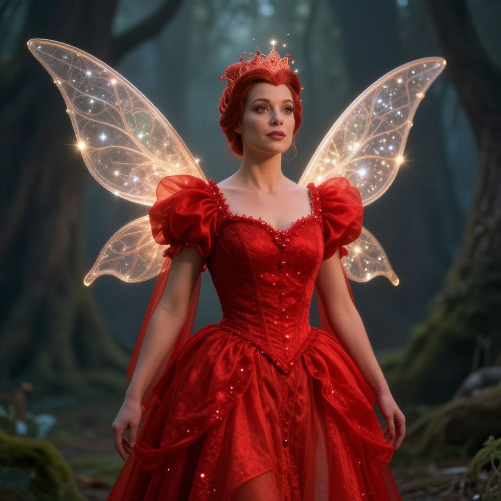Photograph of a smiling woman with curly red hair, wearing an elaborate, colorful Renaissance-style circus costume. Her dress features intricate gold and blue patterns, puffed yellow sleeves with white lace cuffs, and a large white lace ruffle around the collar. She has a black feathered hat with a yellow band. She waves with her right hand, while her left arm is extended to the side. The background shows a circus tent with red and white stripes, illuminated by warm, glowing lights. The setting has a festive, theatrical atmosphere. The woman's makeup is bold, with red lipstick and dark eyeliner.