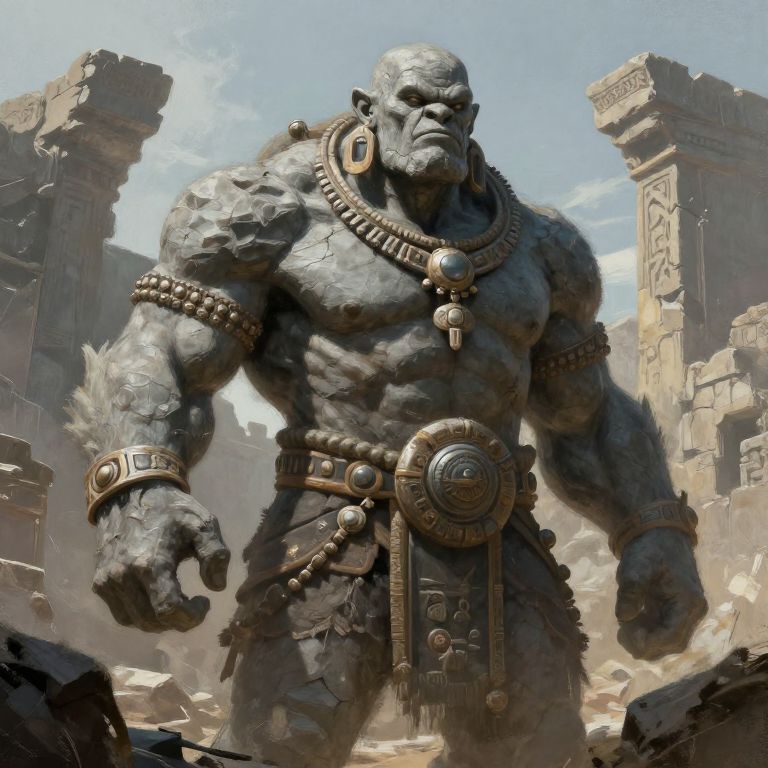 Digital artwork of a muscular, stone-like ogre standing in a ruined, ancient temple. The ogre has a rough, grayish texture, exaggerated muscles, and a stern expression. He wears a large, ornate necklace with circular medallions, arm bands, and a belt with a circular, intricate plate and hanging tassels. The background features broken stone pillars and a cloudy sky, with dust swirling around the ogre's feet. The art style is highly detailed and realistic, with a focus on the ogre's imposing and formidable presence.