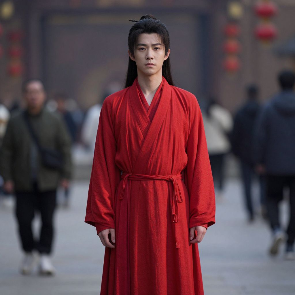Photograph of an East Asian woman with long black hair standing in a bustling street. She wears a vibrant red traditional Chinese kimono-style robe with a belt tied at the waist. Her expression is serious and focused. The background is slightly blurred, showing several people in dark clothing, some with backpacks, walking on a cobblestone street. Red lanterns hang on the building in the background, adding cultural context. The overall color palette contrasts the bright red of her robe with the muted tones of the street and background. The image has a shallow depth of field, emphasizing the subject.