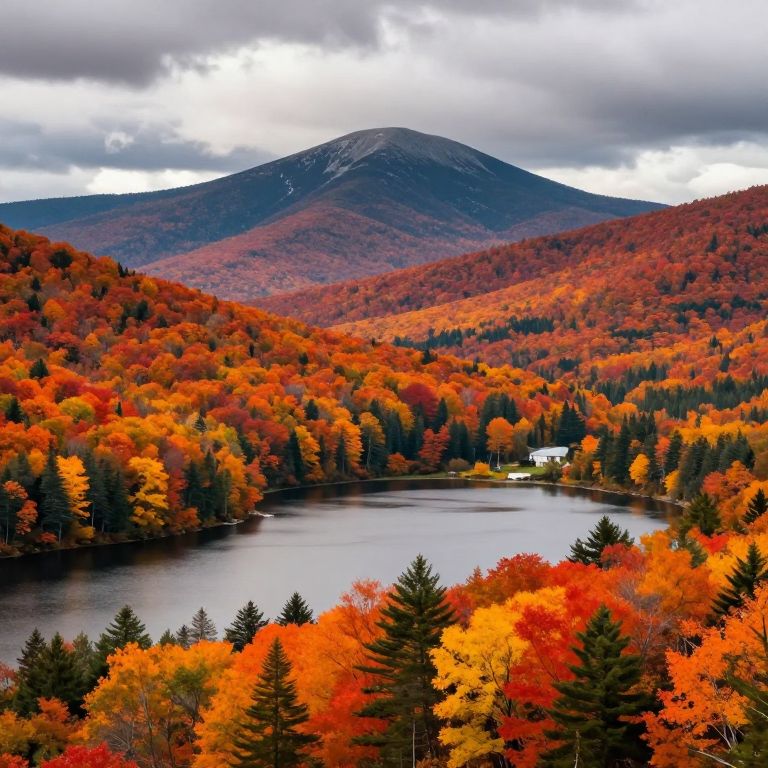 Spectacular autumn foliage blankets the rolling hills of the Adirondack Mountains in upstate New York, with vibrant shades of orange, red, and yellow cascading down toward serene lakes, framed by a majestic, cloud-capped peak under a moody sky.