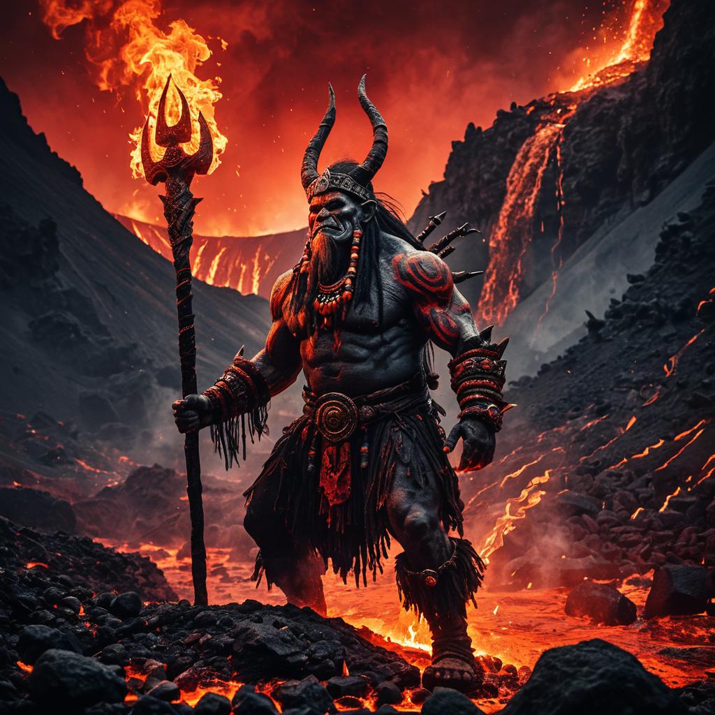 A highly detailed and dramatic digital illustration of a fierce troll shaman standing in a volcanic crater. The shaman is muscular, with dark skin marked by red tribal tattoos, wearing molten metal armguards and rugged clothing. He holds a smoking obsidian staff topped with flames. The background features glowing lava flows and a blood red sky, with intense volcanic activity and fiery embers cascading around him.
