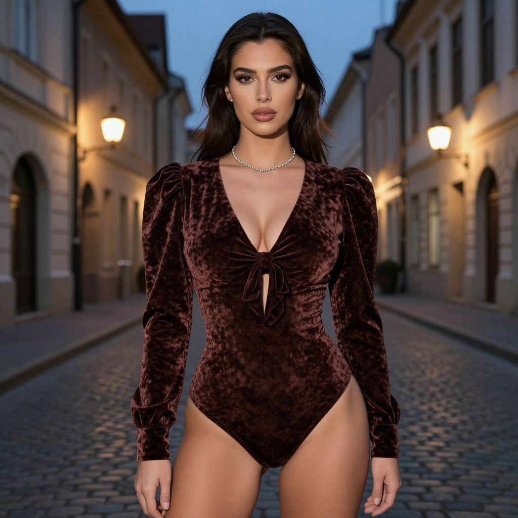 A woman, chic glam, velvet bodysuit in rich brown, deep V-neckline with front knot detail, voluminous long sleeves with fitted cuffs, high-cut leg, delicate silver chain necklace, twilight photography, dusk colors, soft glow, standing on a cobblestone street, historic buildings, warm streetlights, soft shadows, elegant and mysterious atmosphere Sexy. Pretty face and beаutiful eyes. Big breasts