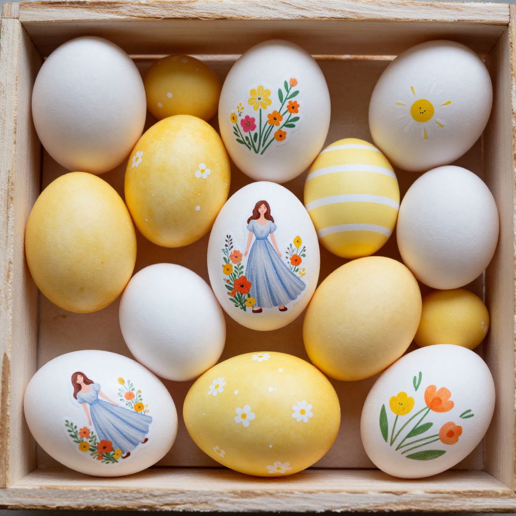 Colorfully decorated Easter eggs, featuring stickers of a woman in a flowing dress surrounded by vibrant flowers, are artfully arranged in a wooden crate, showcasing a mix of white and yellow hues with varying sizes and floral designs.