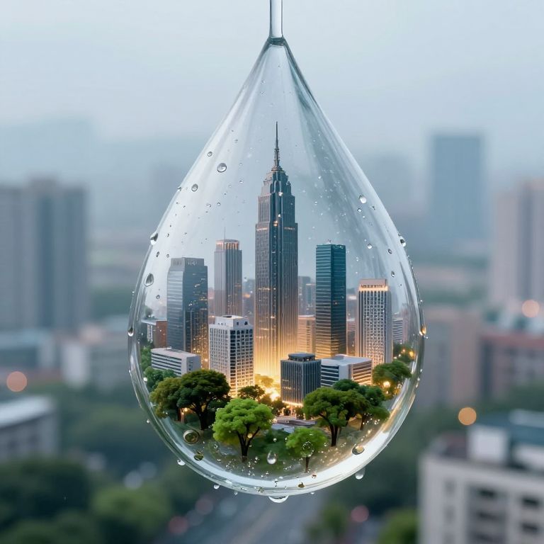 A teardrop-shaped raindrop cradles a luminous miniature metropolis, where towering skyscrapers and verdant trees coexist in perfect harmony, suspended in a dreamy, bokeh-lit world.