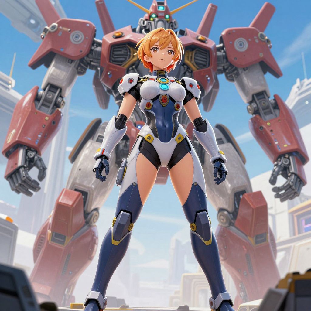 Digital anime-style artwork of a blonde, blue-eyed female mecha pilot in a white and blue armored suit, standing confidently in front of a large red
