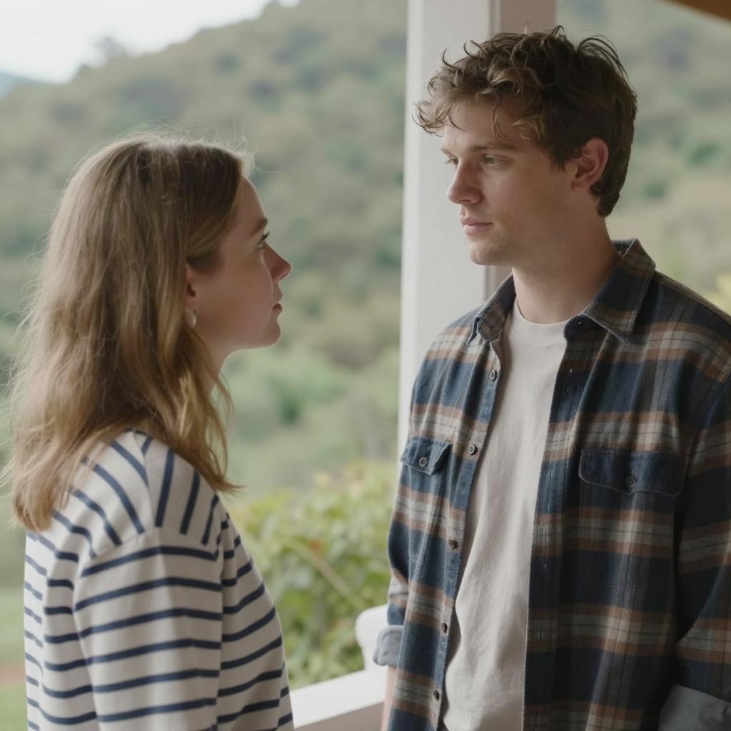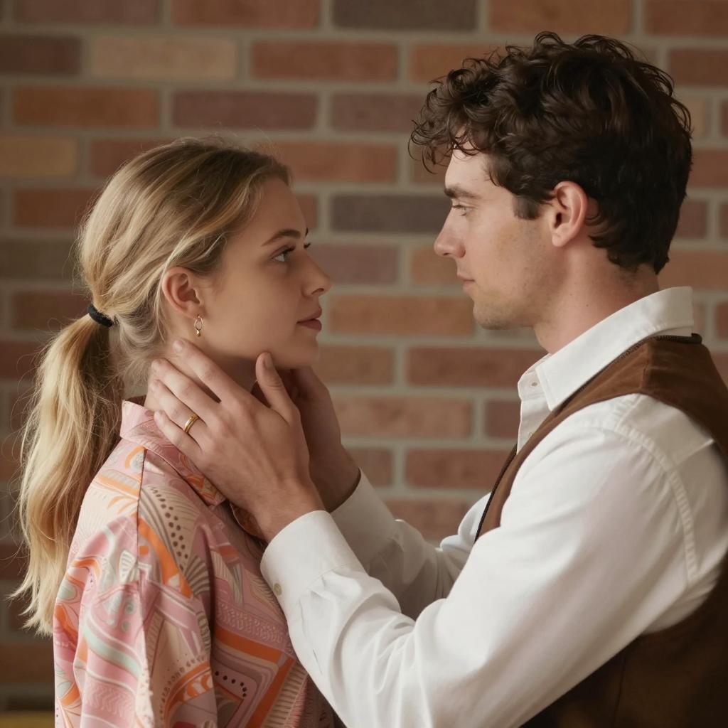 Two people in a dimly lit room. A woman with blonde hair and a white shirt smiles, leaning forward. A man with dark hair and a navy shirt stands closely behind her, looking at her with a gentle expression. Soft light illuminates her face from the right. Both have light skin.