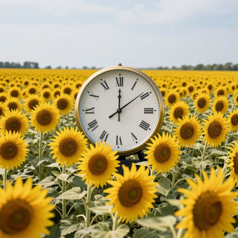Photograph of a sunlit field filled with vibrant yellow sunflowers, featuring a large, round, analog clock with black Roman numerals and hands, placed slightly off-center in the middle ground. The clock's face is white, with black hour and minute hands pointing to 10:10. The sunflowers, with dark brown centers, fill the foreground and extend into the background, creating a dense, colorful sea. A distant tree line is visible under a clear blue sky, adding depth to the image. The clock stands out against the bright yellow flowers, contrasting sharply with the green stems and leaves.