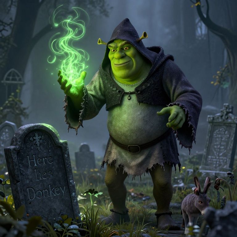 Shrek, dressed as a necromancer in a dark, tattered hooded robe, stands in a misty, overgrown cemetery, He is using green necromantic energies to raise Donkey from a grave, A tombstone reads \"Here lies Donkey\